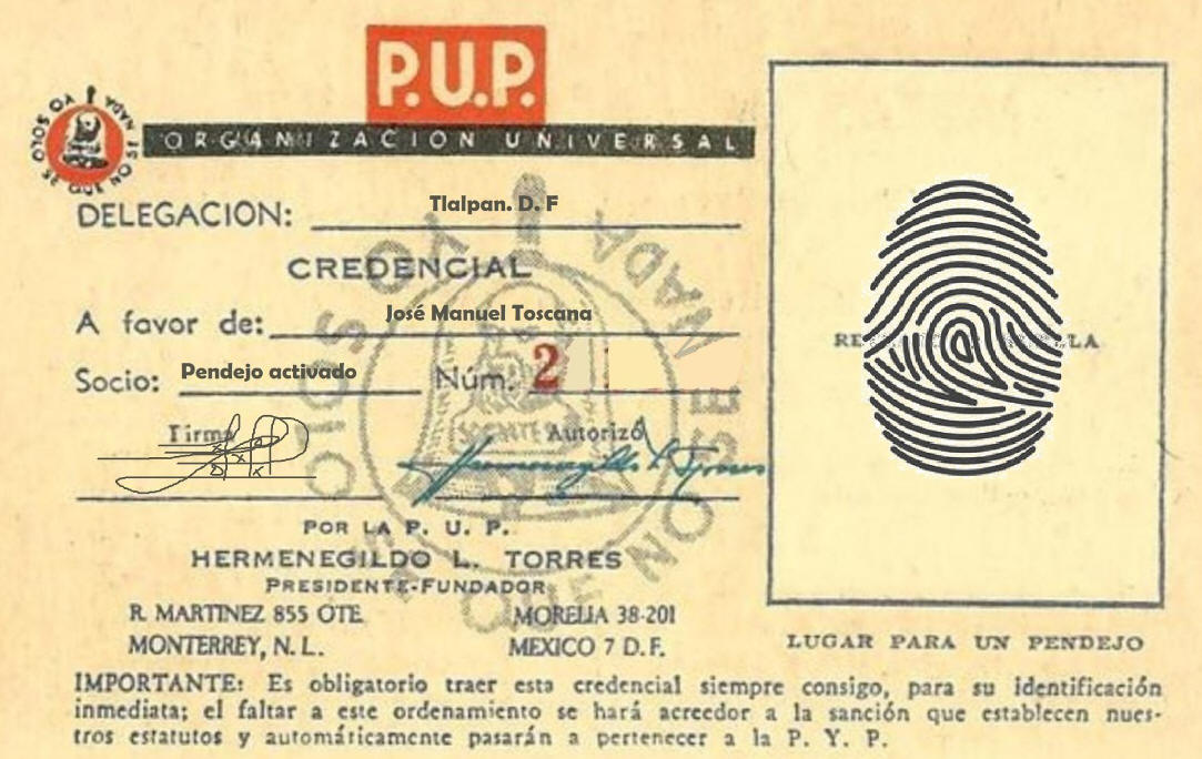 Lo que sea de cada quien, los afiliados a la fecha, cumplen cabalmente los elementos básicos para ser morenistas bienamados. ¿alguna duda? ** Años ha, en Monterrey, concurrí al taller de grabado de otro gran pensador nacional, Hermenegildo Hernández Torres, creador y fundador del PUP “Partido Unico de Pendejos” pagué la cuota inicial de 50 pesos en 1959, me entregó el catálogo de variantes de las pendejadas -50 básicas- y le solicité mi credencial donde figuraría mi fotografía , bajo la leyenda: “Lugar para un Pendejo” para identificarme como “Pendejo activado”