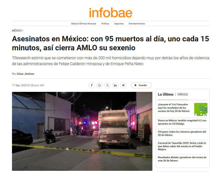 ** El Mundo sigue su marcha inexorable, México sigue su camino lleno de éxitos indiscutibles, como la enorme criminalidad cotidiana con su magnífico promedio oficial de 95 muertitos día tras día.